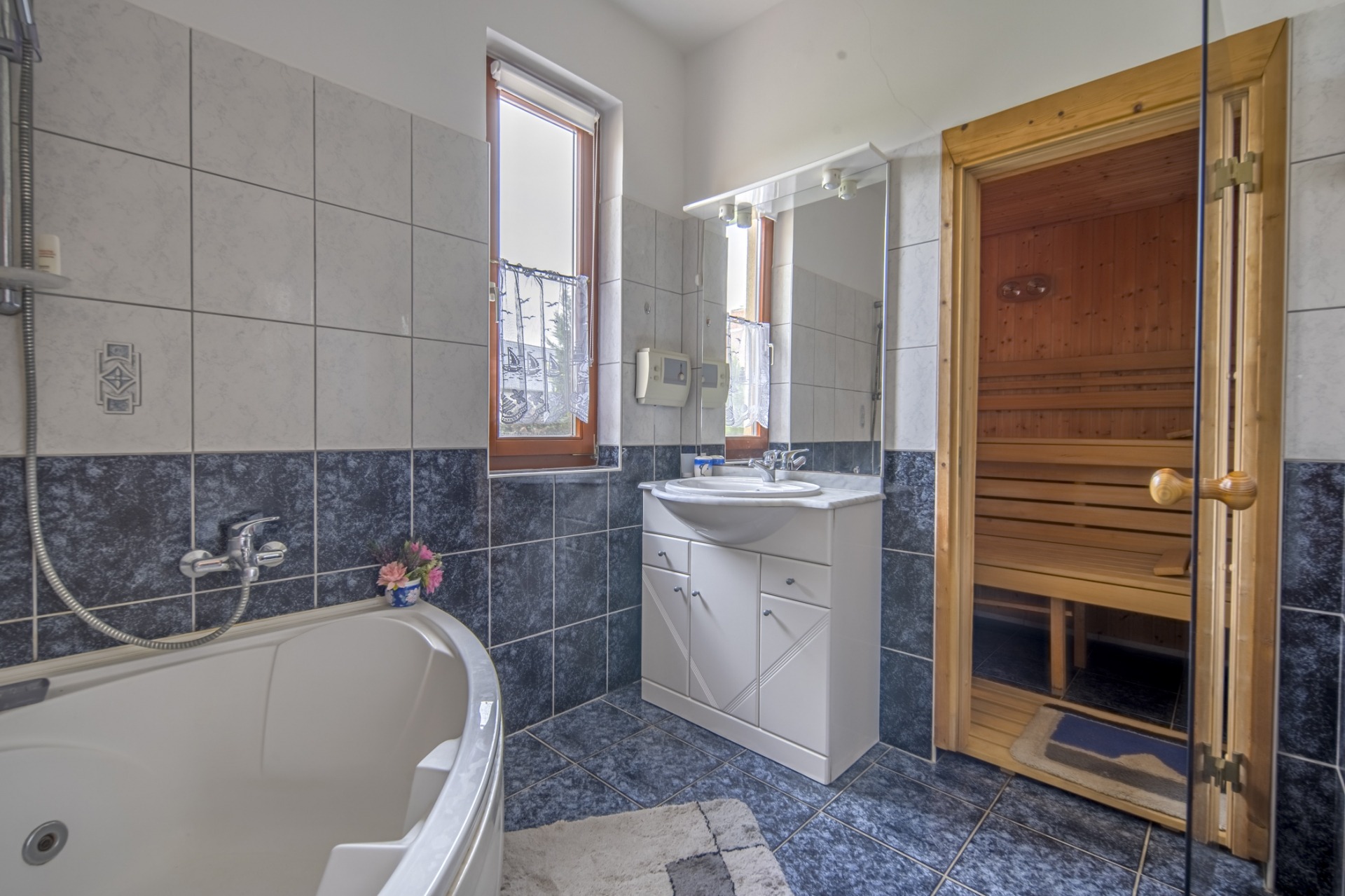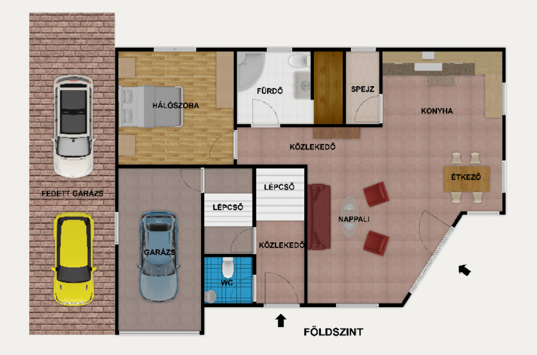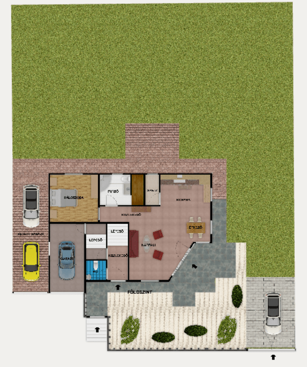 A földszinten egy hálószoba, amerikai konyhás nappali, sarokkádas fürdőszoba beépített szaunával, külön WC és kamra kapott helyet, az emeleten három hálószoba, egy emeleti nappali és egy zuhanykabinos fürdőszoba található.