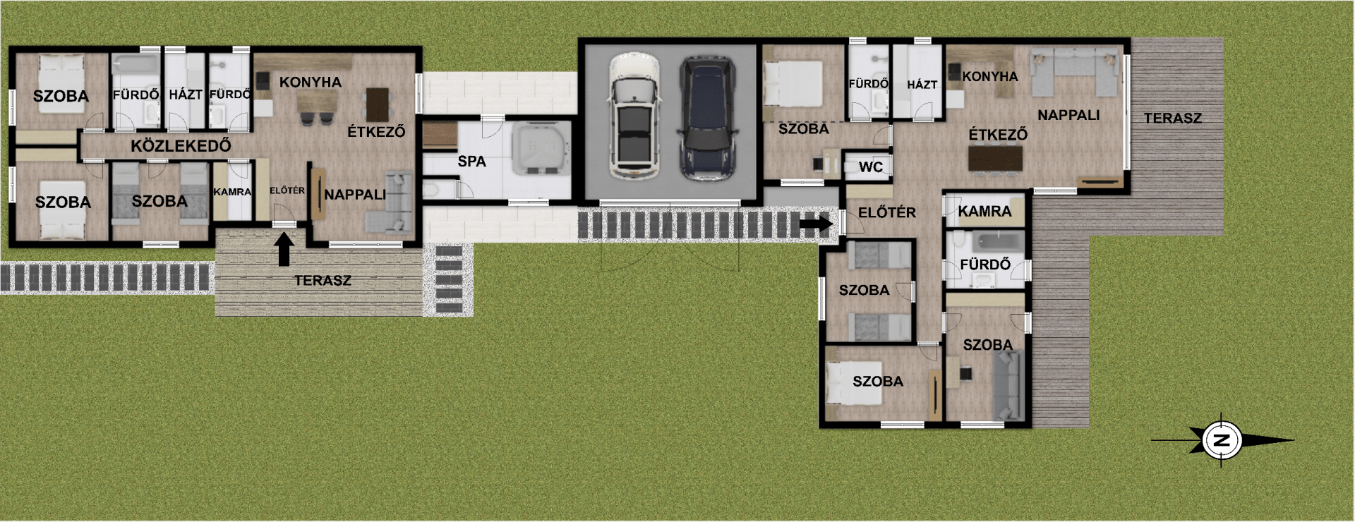 4 hálóval, 2 fürdővel, külön mosdóval, teraszokkal, 2 garázzsal rendelkező főépület.