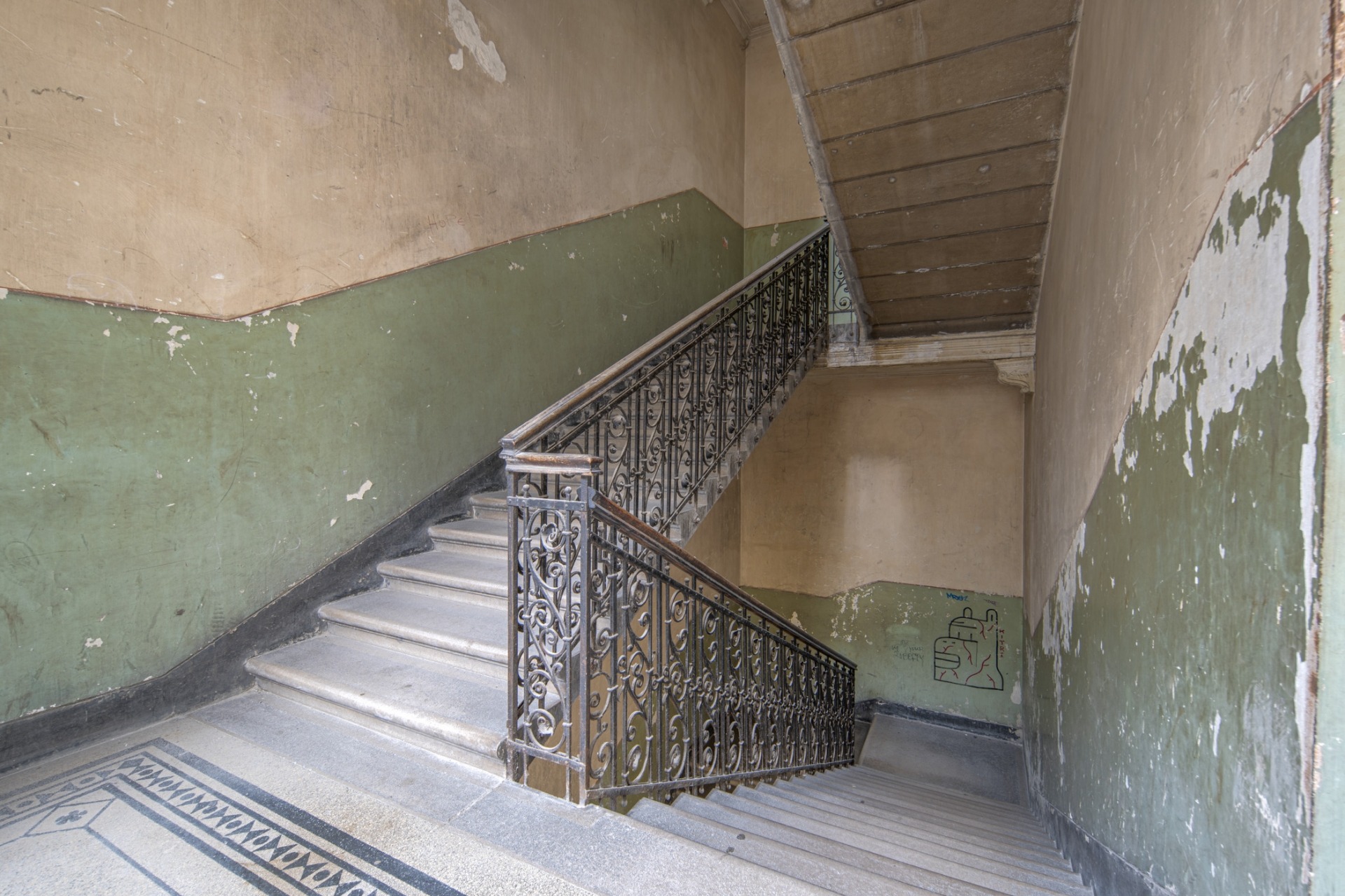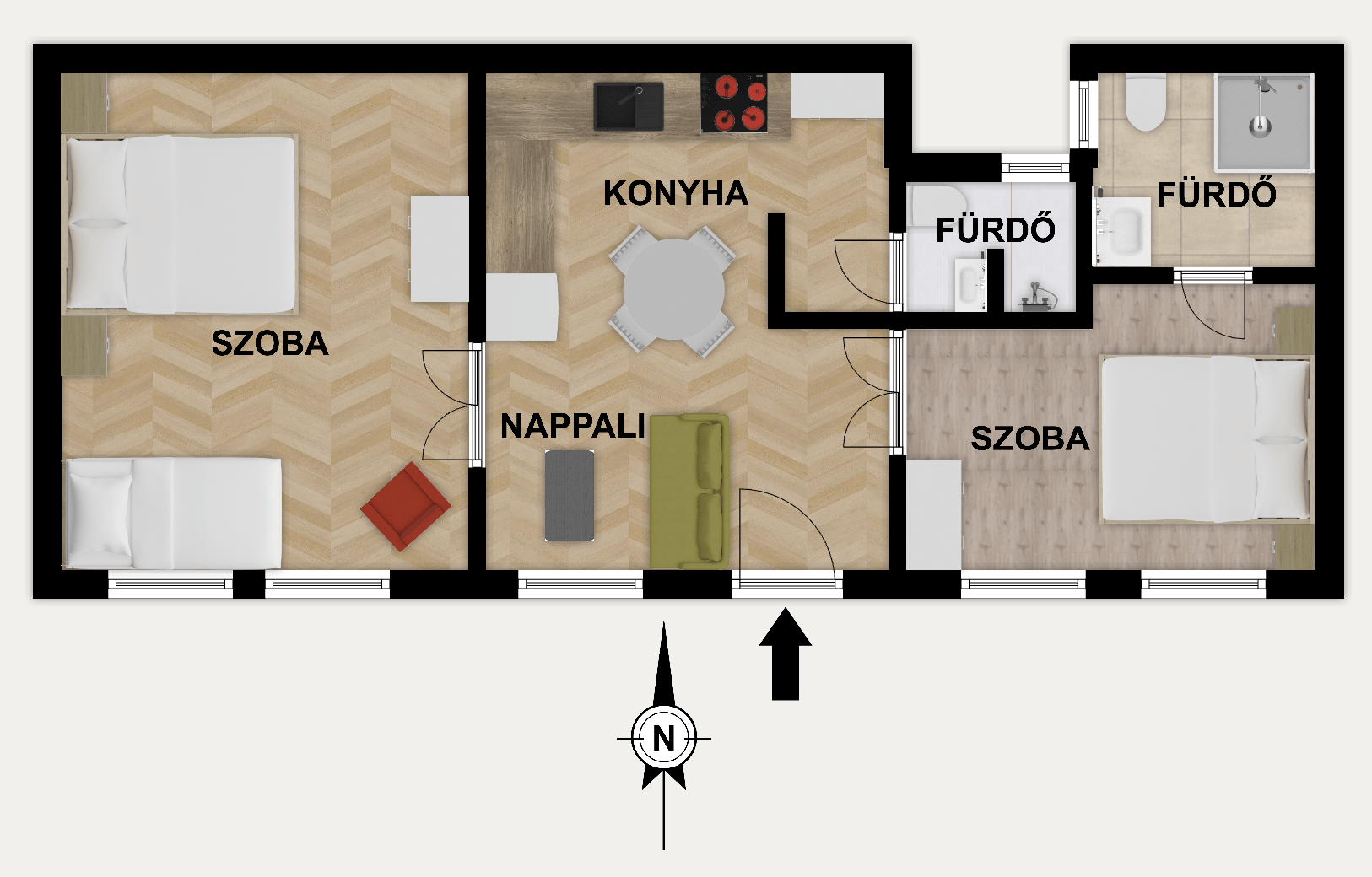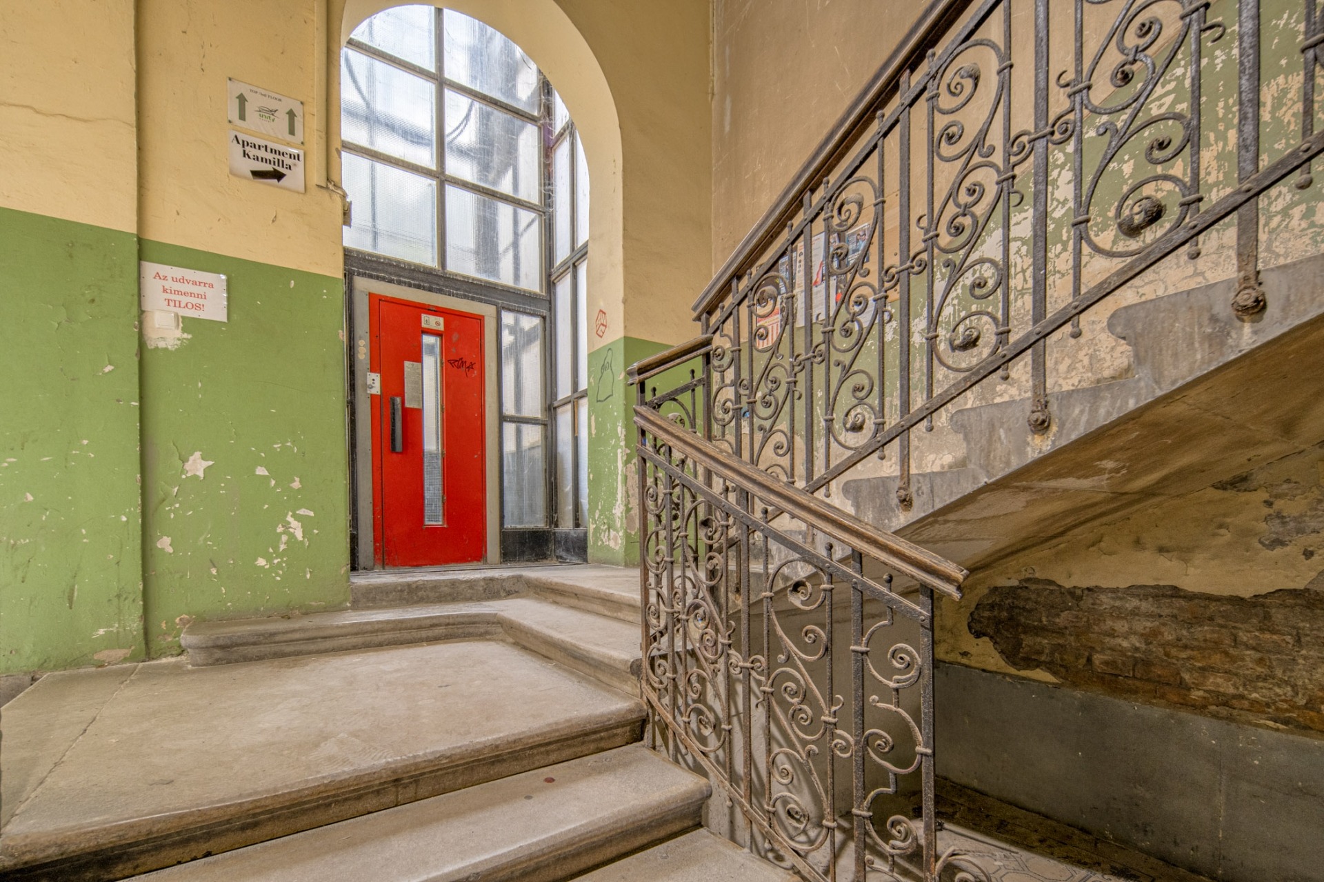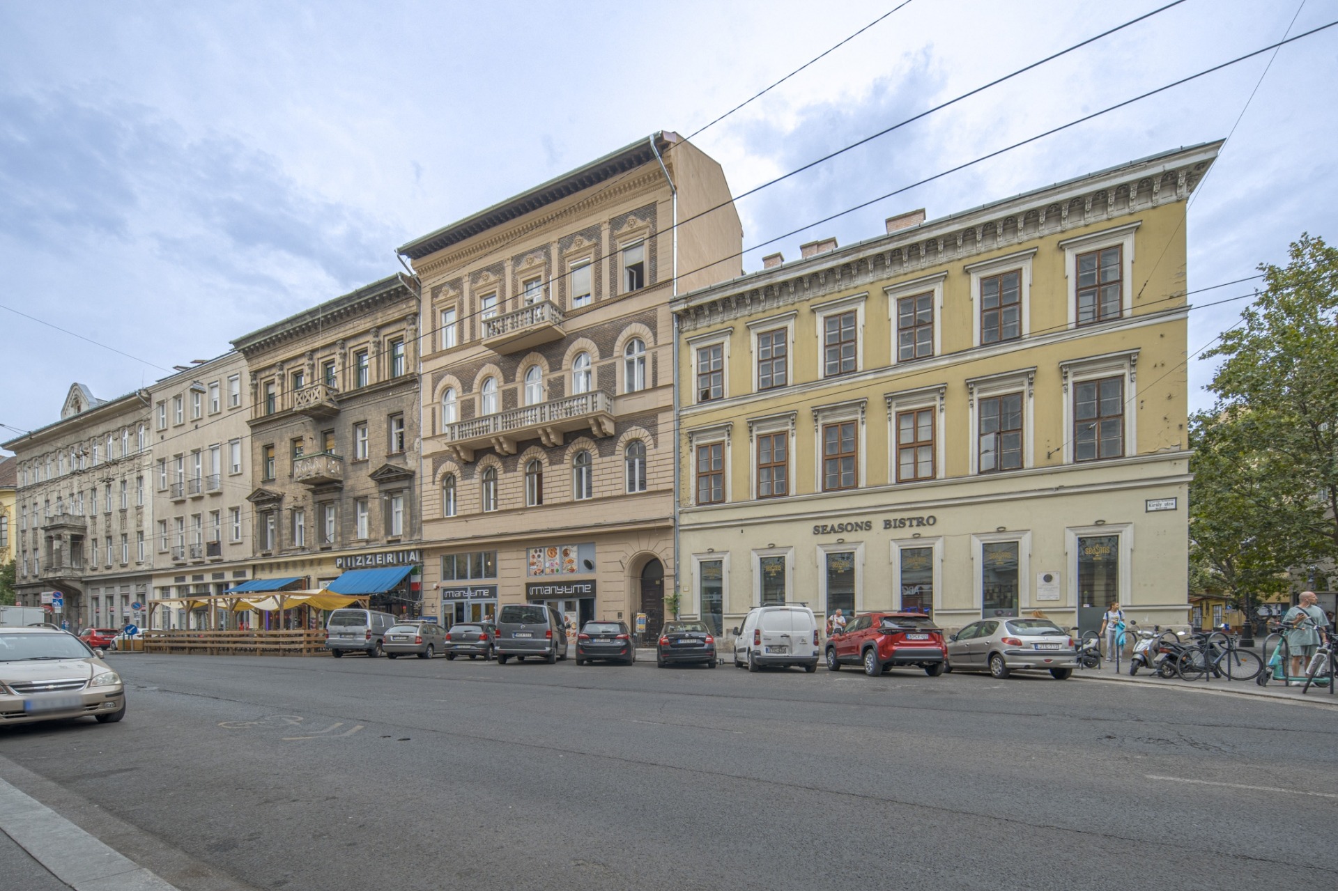 Király utca 60. 69 m2, (valóságban 71 m2), 1. emelet, amerikaikonyhás nappali, 2 háló, 2 fürdő, közlekedő. Az ablakok a csendes, belső udvar felé néznek.